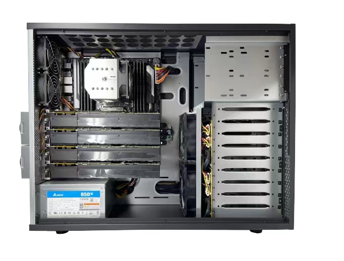 - 最大支持前置 9 个热插拔硬盘位(最大支持4 个NVME U.2)和后置2个GPU散热套件;